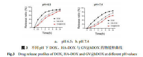 利用透析法对DOX、HA-DOX和GV@hDOX药物释放能力进行测定,检测并记录了DOX、HA-DOX和GV@hDOX在pH 6.5和pH 7.4下DOX的释放量(图3)。