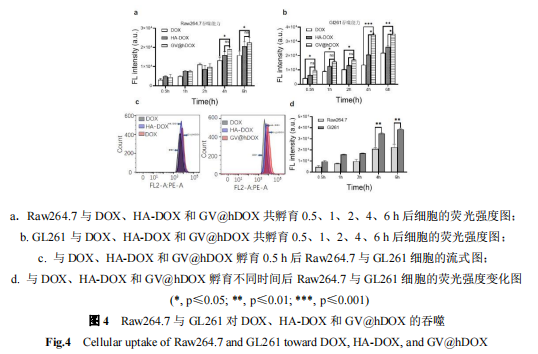 由图4a、4c荧光强度变化可知,在4.0 h内,与DOX和HA-DOX相比,Raw264.7对GV@hDOX吞噬量无明显提高;6.0 h时,由于气囊蛋白的小尺寸效应增强了巨噬细胞的非特异性吞噬,GV@hDOX处理后的细胞具有更高的荧光强度。
