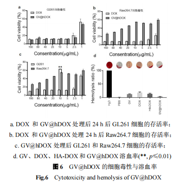 通过GL261细胞和巨噬细胞Raw264.7对DOX与GV@hDOX的细胞毒性进行检测,结果如图6所示。