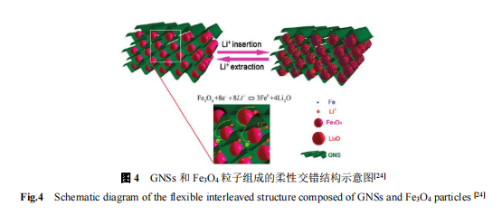 随着电池市场的扩大,锂离子电池已成为满足轻量化、长寿命、快速充电和低成本需求的最佳选择之一。在锂离子电池中,正负极材料的性能直接影响其使用性能和安全性。在负极材料方面,Zhou等[24]通过在石墨烯纳米片之间原位还原氢氧化铁,成功合成了一种柔性交错石墨烯(GNSs)/Fe3O4复合材料作为锂离子电池的负极材料,如图4所示。