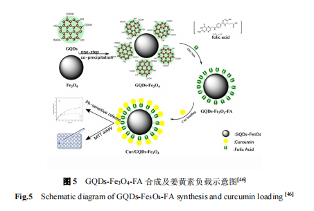 磁性石墨烯纳米载体具有良好的磁性,能够通过外加磁场控制药物的递送。Elham等[46]研究设计了一种基于磁性的靶向多功能抗癌药物载体,通过将姜黄素(Curcumin)、石墨烯量子点(GQDs)、磁性纳米复合材料(Fe3O4)和叶酸(FA)结合,实现了靶向治疗癌细胞的高效性,如图5所示。