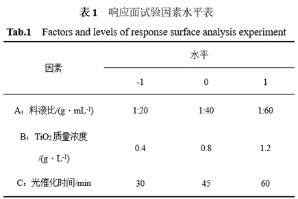 所有实验进行3次重复,在经过上述实验后,选择料液比、TiO2质量浓度以及光催化时间3个因素,采用Design-Expert 8.0中的Box-Behnken实验模型来进行三因素三水平实验对预处理工艺参数进行优化。