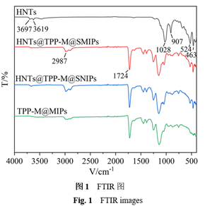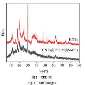 红外图谱表明功能单体MAA和交联剂EGDMA成功合入聚合物中。XRD图谱中HNTs的特征衍射峰均能在HNTs@TPP-M@SMIPs中找到,证明了聚合物包裹在HNTs表面。