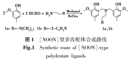合成路线如图1。按照文献[17]方法,向100 mL的圆底烧瓶中依次加入2.76 g (20 mmol)2-甲氧基-4-甲基苯酚、25 mL无水甲醇、0.88 g (10 mmol)N,N-二甲基乙二胺和0.60 g (20 mmol)多聚甲醛,加热回流72 h后停止反应,用旋转蒸发仪蒸干溶剂,得黑色油状液体,柱层析分离(硅胶填充柱,V(二氯甲烷):V(甲醇)=5:1洗脱),得3.30 g白色粉末6,6’-((2 -(二甲胺基)乙基)氮甲双基)双(2-甲氧基-4-甲基苯酚)1a,产率85%。配体6,6’-((2 -(吡啶-2-基)乙基)氮甲双基)双(2-甲氧基-4-甲基苯酚)1b的制备方法与1a相似。