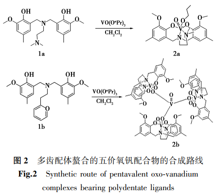 合成路线如图2。在氮气氛下,向干燥的反应器中加入0.388 g(1.0 mmol)多羟基配体1a和20 mL二氯甲烷, 室温搅拌10 min使固体溶解,转移至20 mL含有0.244 g(1.0 mmol)VO(OnPr)3的二氯甲烷溶液中,得黑红色溶液,搅拌反应12 h。将溶液浓缩至10 mL,加入无水正己烷20 mL,析出紫黑色晶状化合物,得到0.420 g6,6’-((2 -(二甲胺基)乙基)氮甲双基)双(2-甲氧基-4-甲基苯酚)钒配合物 2a,产率82%。6,6’-((2 -(吡啶-2-基)乙基)氮甲双基)双(2-甲氧基-4-甲基苯酚)钒配合物2b 以相似的方法制备。
