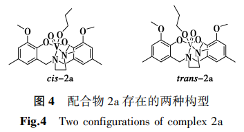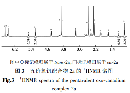 五价钒配合物具有抗磁性,可以很方便的利用NMR技术研究配合物的结构。通过通过配合物2a的1HNMR谱图我们可以发现,体系中存在两种构型的分子(图3)。