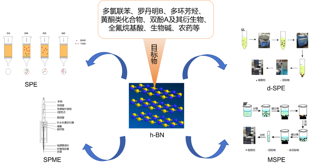 1.综述了近几年六方氮化硼及其复合材料在样品前处理技术(固相萃取、分散固相萃取、固相微萃取、磁性固相萃取等)中的应用研究进展;