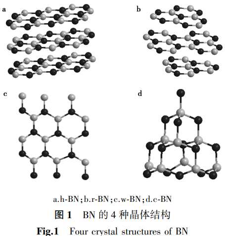 氮化硼是一种由硼原子和氮原子有序地组成、具有晶体性质的最简单的硼氮高分子化合物,通常用BN表示。BN具有高化学稳定性、高耐热性、高导热性等优异性能,引起了科研人员的兴趣和关注,研究发现BN可应用于光电子、化妆品、高性能航空防摩擦、复合陶瓷改性等众多领域[11]。由于BN原子轨道sp2或sp3的杂化方式,B原子和N原子以不同的原子排列和杂化形式形成了不同结构的BN晶体,常见的有六方氮化硼(h-BN)、菱面体氮化硼(r-BN)、纤锌矿型氮化硼(w-BN)、立方氮化硼(c-BN)等4种晶体结构,如图1所示。