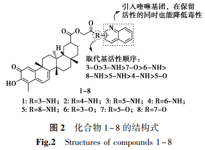 靶向缺氧诱导因子-1α(Hypoxia inducible factor-1α,HIF-1α)及其信号通路是治疗癌症的一个有效措施,研究表明,雷公藤红素是HIF-1α的靶向抑制剂[11]。喹啉是发现和开发癌症治疗药物最重要的核心结构之一[12,13],为开发有效的HIF-1α抑制剂,Shang等[14]依据药物设计的拼合原理,在雷公藤红素28位羧基上引入喹啉基团,合成了衍生物1~8(图2)。