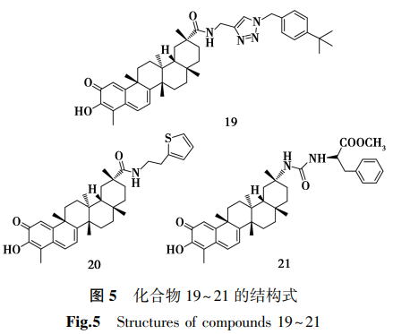 研究证明,雷公藤红素是信号转导子和转录激活子3(Signal transducer and activator of transcription 3,STAT3)的靶向抑制剂[24]。基于此,Xu等[25]对28位羧基进行结构修饰,合成了衍生物20(图5)。
