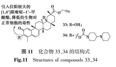 雷公藤红素3位的羟基能与半胱天冬酶 3(Cysteinyl aspartate specific proteinase 3,Caspase-3)蛋白相互作用,导致该蛋白过度激活,促近Caspase-3以非选择性的方式强烈抑制肿瘤细胞和正常细胞的增殖,这是雷公藤红素选择性差以及毒性强的原因之一[41-43]。基于此,Hu等[44]以28-炔丙酯基-雷公藤红素(33,图11)为先导化合物,合成了化合物34(图11)。