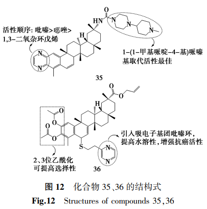 Su等[46]对6位和28位羧基同时修饰,设计合成了衍生物36(图12)。该化合物对人骨肉瘤细胞HOS的抑制活性(IC50=0.82 μmol/L)优于阳性药雷公藤红素和顺铂(IC50分别为1.25、11.21 μmol/L),对HOS细胞和人正常肝细胞的选择性(SI=6.72)也优于雷公藤红素(SI=2.27)。构效关系表明:2、3位乙酰化能增加衍生物的选择性;6位以C-S键引入吸电子基团,如吡嗪,可以提高衍生物的水溶性,增强抗癌活性。