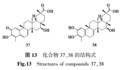 Ma等[50]采用雷公藤内生菌转化的方法,产生了2个结构新颖的化合物37、38(图13)。