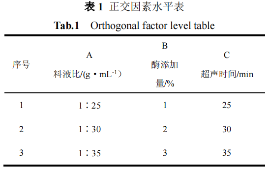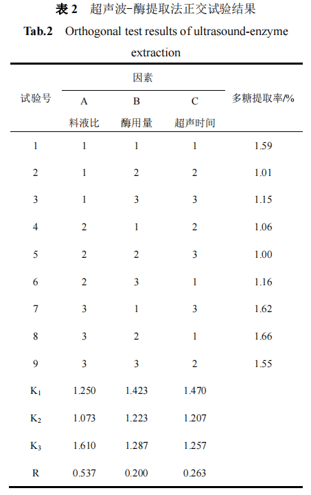 通过改变料液比、纤维素酶的用量、超声时间分别进行单因素试验,然后选择最佳的工艺参数进行正交试验,用紫外可见分光光度法对吸光度进行测定,采用多糖的提取率作为质量评价指标。根据表1进行试验计算艾叶多糖得率。