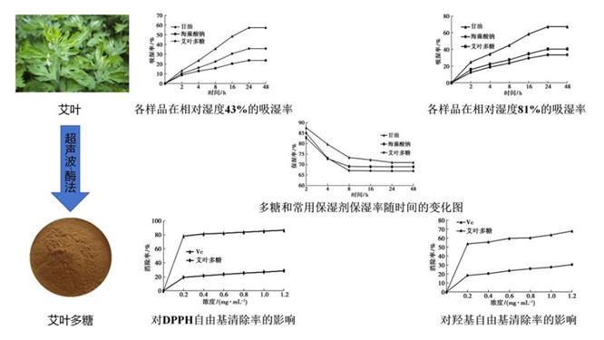 1.报道了超声波-酶法提取艾叶多糖的工艺优化条件,对大别山艾叶多糖的吸湿、保湿性能和抗氧化性能进行了研究;