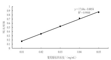 横坐标为葡萄糖标准溶液的浓度,纵坐标为葡萄糖标准溶液在波长490 nm处所测得的吸光度,以此来绘制葡萄糖标准曲线,如图1所示。