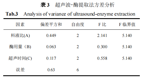 由表2与表3的结果分析表明,料液比1∶35 (g/mL)、超声时间25 min、纤维素酶添加量1%为超声波-酶法提取艾叶中多糖的最佳工艺条件。