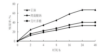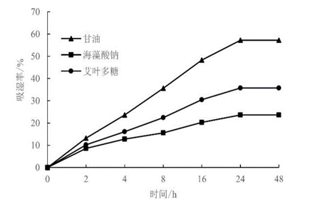 甘油、海藻酸钠、艾叶多糖在湿度为43%的饱和碳酸钠的环境下放置0~48 h的吸湿率如图5所示。