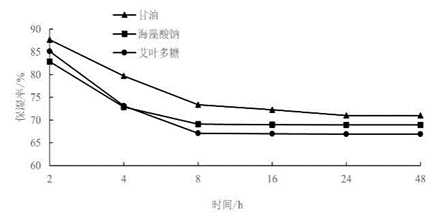 图7 多糖和常用保湿剂保湿率随时间的变化图