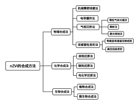 根据合成原理的不同,nZVI的合成方法可以分为物理合成法、化学合成法和生物合成法,如图1所示。
