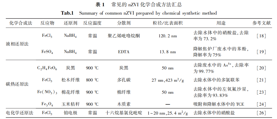 化学合成法的合成路线简单,反应速度快,制备的nZVI具有纯度高、活性高、尺寸小且均匀的特点,是目前最广泛被采用的nZVI合成方法。常见的化学合成法制备nZVI,如表1所示。