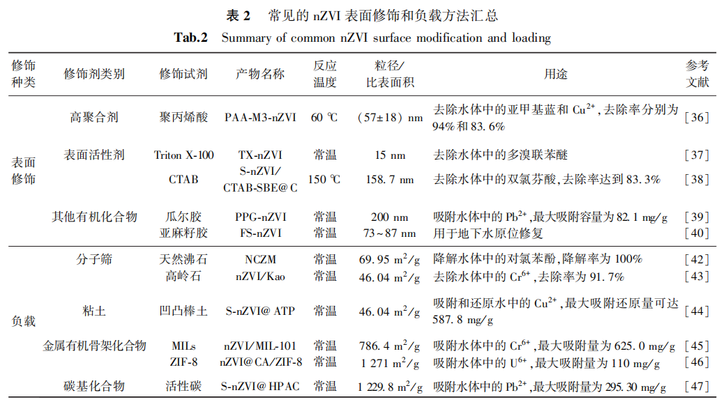将nZVI均匀地负载于载体内部或表面可以提高其分散性和稳定性,并避免其聚集和钝化,是一种常用的nZVI修饰方法。常见的nZVI表面修饰和负载方法列于表2。