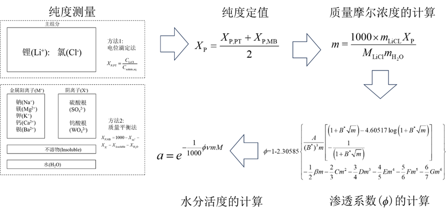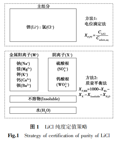有两种方法来确定LiCl的纯度:电位滴定法和质量平衡法,如图1所示。以这两种方法的结果的平均值作为LiCl的纯度的标准值。