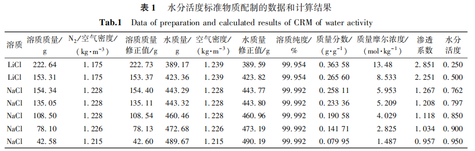 制备了5种不同浓度的NaCl溶液水分活度标准物质,配制的原始数据和计算结果详见表1。
