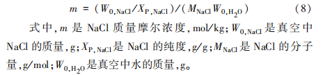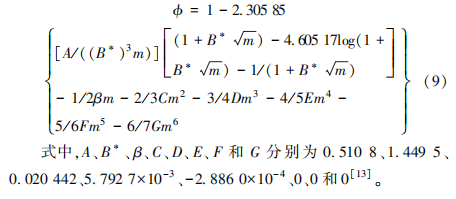 按照公式(8)计算得到溶液中NaCl的质量摩尔浓度m,将m代入渗透系数的拟合方程(德拜-休克尔方程,即式(9))中[13],得到该浓度下NaCl溶液的渗透系数(ϕ)。计算其水分活度(a),结果如表1所示。