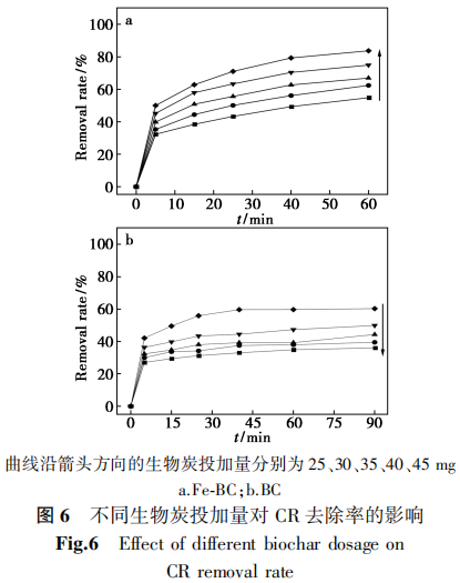 2.2 Fe-BC和BC投加量对CR吸附去除的影响