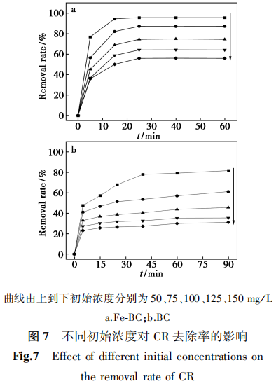 当Fe-BC和BC投加量为40 mg,温度为25 ℃,溶液pH为3时,分析不同初始浓度对CR去除的影响,结果如图7所示。
