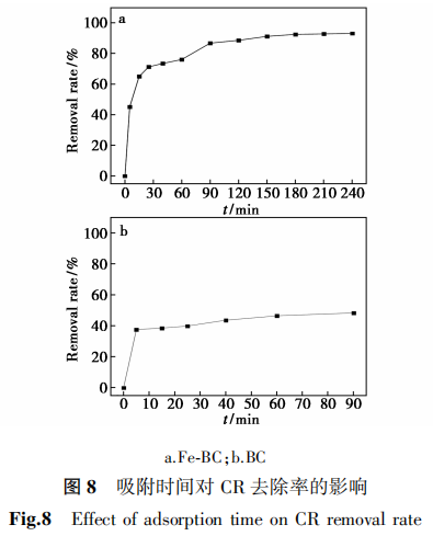 为确定吸附的平衡时间,当CR浓度为100 mg/L,Fe-BC和BC投加量为40 mg,温度为25℃,溶液pH为3时,考察吸附时间对CR去除的影响,结果如图 8所示。