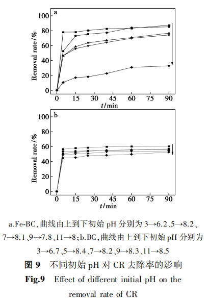 当CR的初始浓度为100 mg/L,Fe-BC和BC投加量为40 mg,温度为25℃时,分析不同溶液初始pH值对CR去除的影响,结果如图9所示。