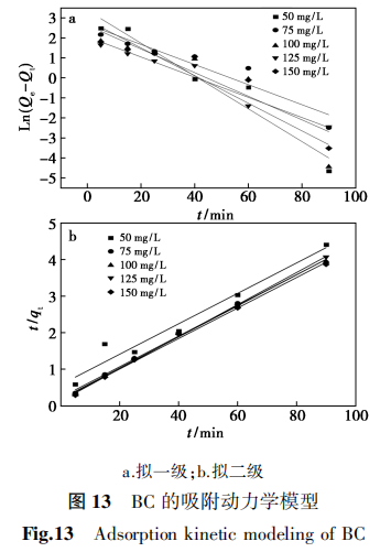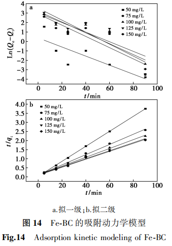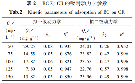 为进一步探究BC、Fe-BC对CR的吸附机理,采用拟一级和拟二级动力学方程对实验所得数据拟合分析,拟合结果如表2、表3和图 13、图14所示。