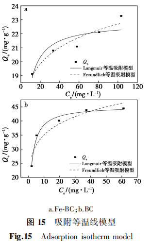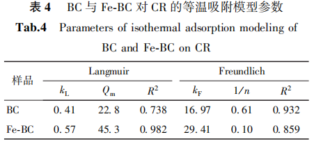 根据BC与Fe-BC在15℃ 吸附平衡时的CR浓度与平衡吸附量,选取Langmuir与Freundlich吸附模型进行模拟,拟合结果如图15所示,各项拟合参数如表4所示。