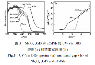 图5显示了Nb2O5、CdS和xCdNb光催化材料的紫外-可见吸收光谱图和Nb2O5、CdS的禁带宽度图。