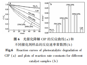 为了进一步考察不同催化剂样品的光催化活性,在光催化反应器中进行环丙沙星(CIP)的可见光降解实验,结果如图6a所示。图6b为各催化剂样品降解CIP的准一级拟合速率常数,15%CdNb最大,为CdS的7.5倍,Nb2O5的20倍。