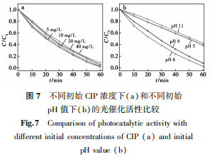 图7进一步显示了15%CdNb光催化剂存在下溶液的初始浓度和pH对可见光降解CIP过程的影响。