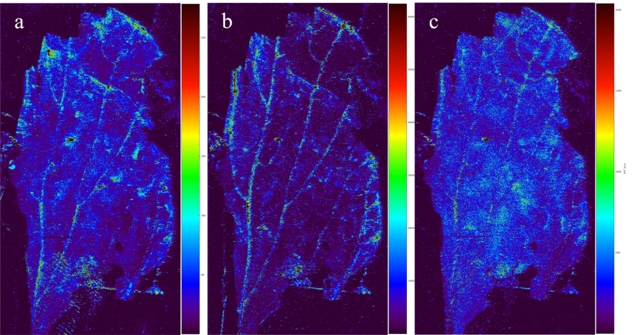 叶片是上海青的主要食用部位,为探究采自铅锌尾矿周围村庄的上海青叶片中Pb等元素的原位分布情况,利用LA-ICP-TOF-MS获得的原位分布图。如图5所示,Pb在叶脉和叶肉中均有分布,但在叶脉中有明显的富集现象。表明Pb经茎部维管束、气孔吸收和角质层吸附进入叶片后[40,35],主要被固定在叶脉,只有小部分存在于叶肉组织中。