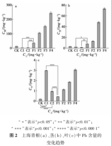上海青根、茎和叶中Pb含量的变化趋势如图2所示。Pb在上海青中含量的高低表现为根>茎>叶,并且在盆栽实验中上海青各器官中的Pb含量随种植土壤中Pb含量的增加而增加。铅锌尾矿样品虽然Pb含量也遵循根>茎>叶,但根中的Pb含量显著低于F1组(p<0.001),而叶中的Pb含量显著大于CK和F1组(p<0.0001)。
