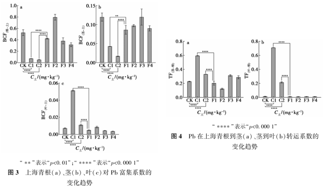 基于ICP-MS测定的Pb含量结果,按1.2.5中的式(2)~(6)对Pb的BCF与TF进行计算,BCF与TF的变化趋势分别如图3和4所示。上海青各器官对铅的BCF和TF表现为BCF(根-土)>BCF(茎-土)>BCF(叶-土),TF(茎-根)>TF(叶-根)(C1除外),铅锌尾矿样品的BCF(根-土)和BCF(茎-土)显著小于CK和F1组(p<0.0001),但BCF(叶-土)、TF(茎-根)和TF(叶-根)显著大于CK和F1组(p<0.0001)。此外,发现在盆栽实验中BCF与TF随种植土壤中Pb含量的增加并不是单调变化。