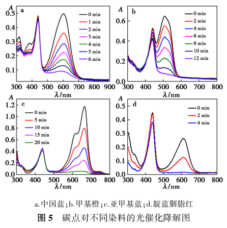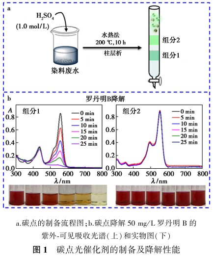 罗丹明B作为工业上常用的有机染料,具有稳定性高、上色强、着色牢等特点,但其存在毒性和致癌性,且含其废水的可生化性差、降解难,故建立高效、清洁的染料废水处理技术已成为广泛研究的热点。光催化法因不使用具有潜在危险的氧化剂,且能把将污染物完全降解,被广泛应用于污水处理。碳点是一种具有水溶性好、化学稳定性强、生物相容性好、抗光漂白的新型碳基材料,已作为光催化材料用于水处理领域。