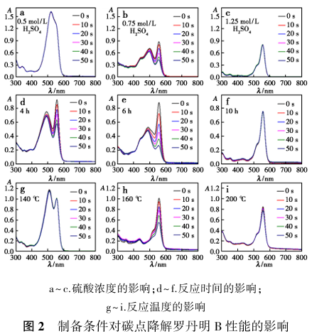 系统研究了硫酸添加量、反应温度以及反应时间对组分1碳点降解性能的影响。如图2a~2c所示,随着加入的酸浓度的增大,碳点光催化降解罗丹明B的速率呈现出先增加后减慢的趋势,其原因可能在于,硫酸浓度低时,碳化能力较弱,碳点结构未完全形成。