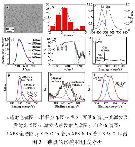 如图3a和3b所示,碳点分布均匀,呈现出大小均一的球形,平均粒径为3.4 nm。大多数纳米颗粒不具有晶格条纹,可能是因为碳点结构中存在较多的聚合物结构,未完全石墨化[21]。