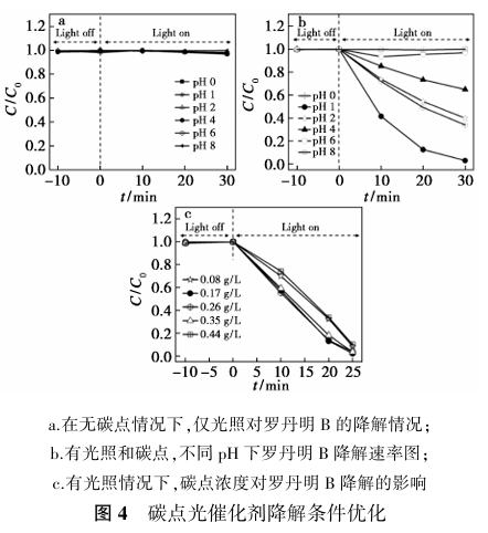 研究了不同测试条件对光催化剂降解性能的影响。如图4a所示,当无催化剂、仅光存在的情况下,罗丹明B不能被降解。加入碳点后先将待降解的溶液在暗处放置10 min,再在光照条件下进行降解。