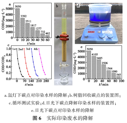 为了探究碳点作为光催化剂的实际应用性能,选取实际印染漆废水为目标污染物进行降解试验。首先,参照国标法(GB11914-8)测定了水样的COD值,大约为5050 mg/L。分别研究实际印染废水在氙灯和日光下的降解效果,结果如图6a所示。