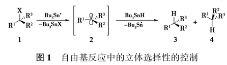 众所周知,对自由基反应中的立体选择性的控制所面临的首要难题是反应过程中所产生的大部分手性碳自由基中间体是平面或者近乎平面三角构型,因此上下两面参与反应的几率是均等的,从而导致外消旋产物的生成。例如卤代烃1在叔丁基锡自由基作用下产生sp2碳自由基中间体2,该中间体可以从两面同时攫取锡烃上的氢,从而得到1:1的外消旋混合物3和4(图1)。