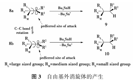 然而与环状自由基相比,非环状碳自由基由于存在C-C键之间的旋转而使得其立体选择性控制更加困难。例如非环状碳自由基8a可以选择性的与烷基锡反应得到单一的非对映异构体9,然而由于存在C-C键旋转,致使8a可以转化为8b,该自由基同样可以选择性的与烷基锡反应得到单一的非对映异构体10,因此,该反应会得到非立体选择性的混合物9和10。