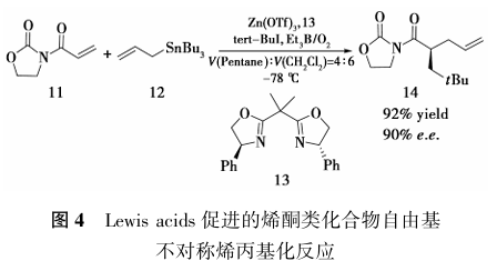 Lewis acids催化的自由基不对称反应策略是目前为止研究较早且被广泛应用的一种控制自由基反应中立体选择性的策略。1995年,Wu等[9]首次利用该策略实现了非环状碳自由基的立体选择性控制(图4)。