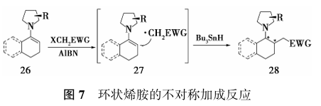 有机催化的自由基不对称反应通过包括3种不同的活化方式(Enamine, Iminium ion, and Dienamine activation)来实现其立体选择性控制[18]。这种策略在过去的二十年里被广泛应用。其中最早的研究是1990年由Renaud和Schubert报道的[19]自由基对预制环状烯胺的不对称加成反应。他们以40%~88%的收率以及最高95:5(Re/Si)的立体选择性得到了以反式非对映异构体为主的目标产物(图7)。